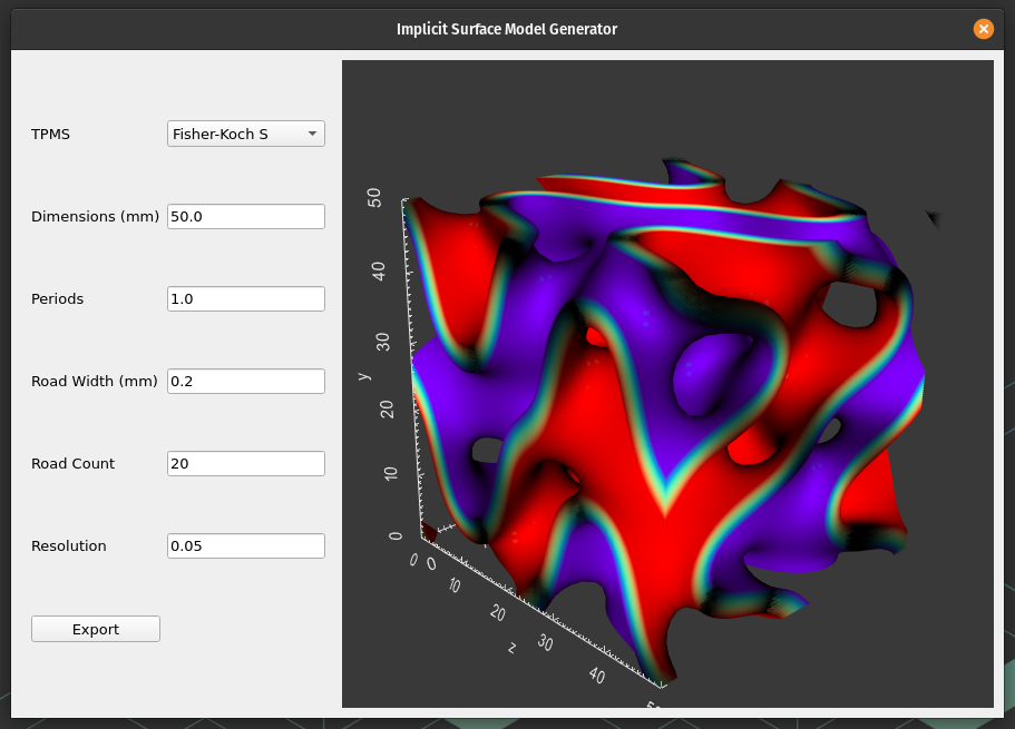 Status: Preliminary testing on the efficacy of Fisher-Koch S as an infill pattern for 3D printed bone scaffolding is underway. Given promising results, the algorithm and software I developed will be used in clinical trials.